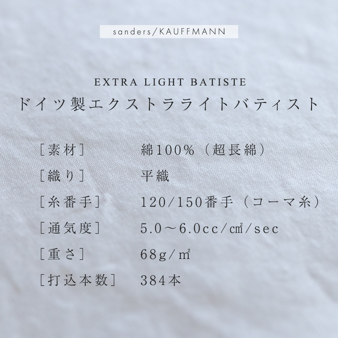生地はドイツの名門・sanders/kauffmannの世界最軽量生地(エクストラライトバティスト)。驚くほど軽いので寝返りがスムーズにでき、肺や心臓といった呼吸器系への負担も少なくなっています。それでいてフィット感もしっかりと感じられるので頼りなさはありません。また日本で販売されている羽毛布団の3〜4倍の通気性があるため、羽毛布団の弱点でもある蒸れ感が軽減され、爽やかな暖かさが得られます。
