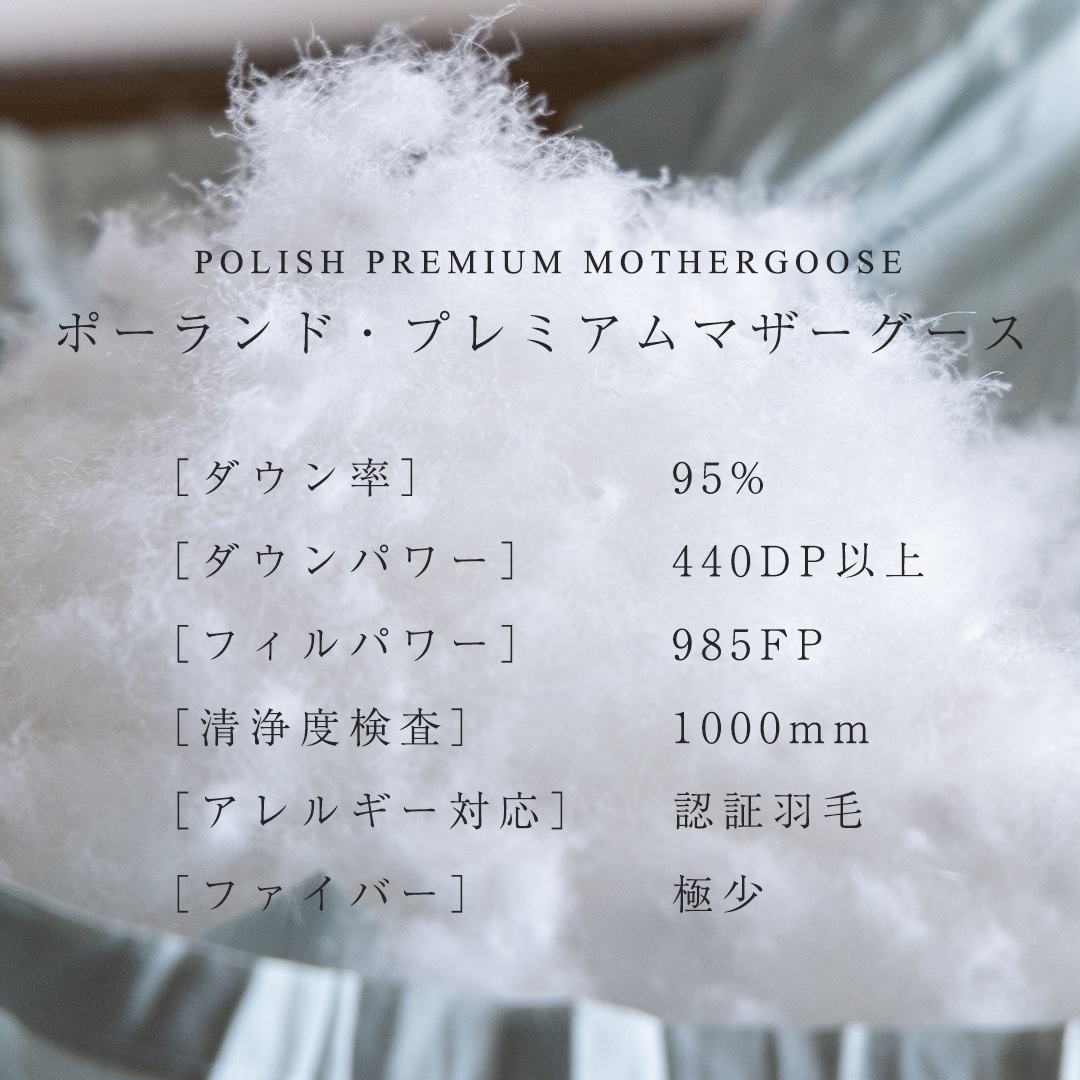 (ダウンパワー440、フィルパワー985、アレルギー対応羽毛認定)